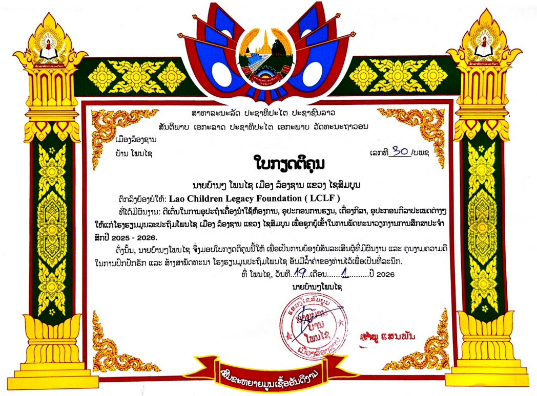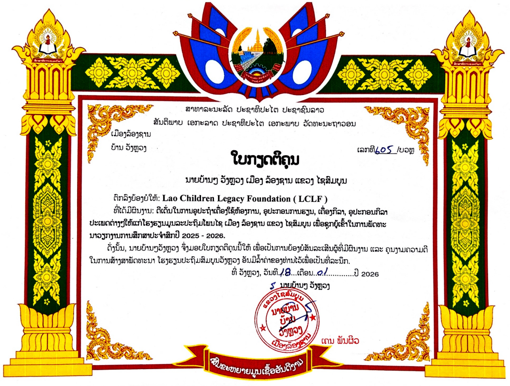 Awards Award Presented by Xaythany District’s Office. In recognition of a donation totaling 2,100,000 Lao Kip. Award of Contribution from Naphok Secondary School in amount of 2,100,000 Lao Kip. Awarded by Vung Luang Chief of the Village, Longxan District, Xaisomboun Awarded by Phon Xai Chief of the Village, Longxan District, Xaisomboun